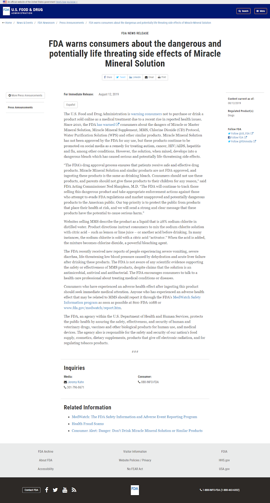 “The FDA’s drug approval process ensures that patients receive safe and effective drug products. Miracle Mineral Solution and similar products are not FDA-approved, and ingesting these products is the same as drinking bleach. Consumers should not use these products, and parents should not give these products to their children for any reason,” said FDA Acting Commissioner Ned Sharpless, M.D. “The FDA will continue to track those selling this dangerous product and take appropriate enforcement actions against those who attempt to evade FDA regulations and market unapproved and potentially dangerous products to the American public. Our top priority is to protect the public from products that place their health at risk, and we will send a strong and clear message that these products have the potential to cause serious harm.”