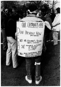 On March 6, 1988, the Galludet University’s board of Trustees announced that a hearing president had been selected as the seventh president to this all Deaf university. The Deaf community on and off campus advocated for Deaf president. That that point there were over 100 Deaf people who possessed doctorates, and more who held positions in administration. Two of the three finalist for the president position were Deaf. Many people were confident that there would be a Deaf president.