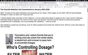 Fluorinating the water supply is against "G-d's will" That he took command against the rebellion He will be instructing rebels to speak at municipality meetings, distribute flyers to "educate against this slow drip atrocity" He will be instructing people how to submit criminal and consumer complaints and sue municipalities for cessation more to come Prozac contains 3 fluorine atoms so it can be called fluoride. 41% of children in the US have keletal fluorosis due to overdose. Fluorinating the water is not approved by the FDA. He sites wikipedia, every one knows that this is the least reliable source because it can be edited by everyone.