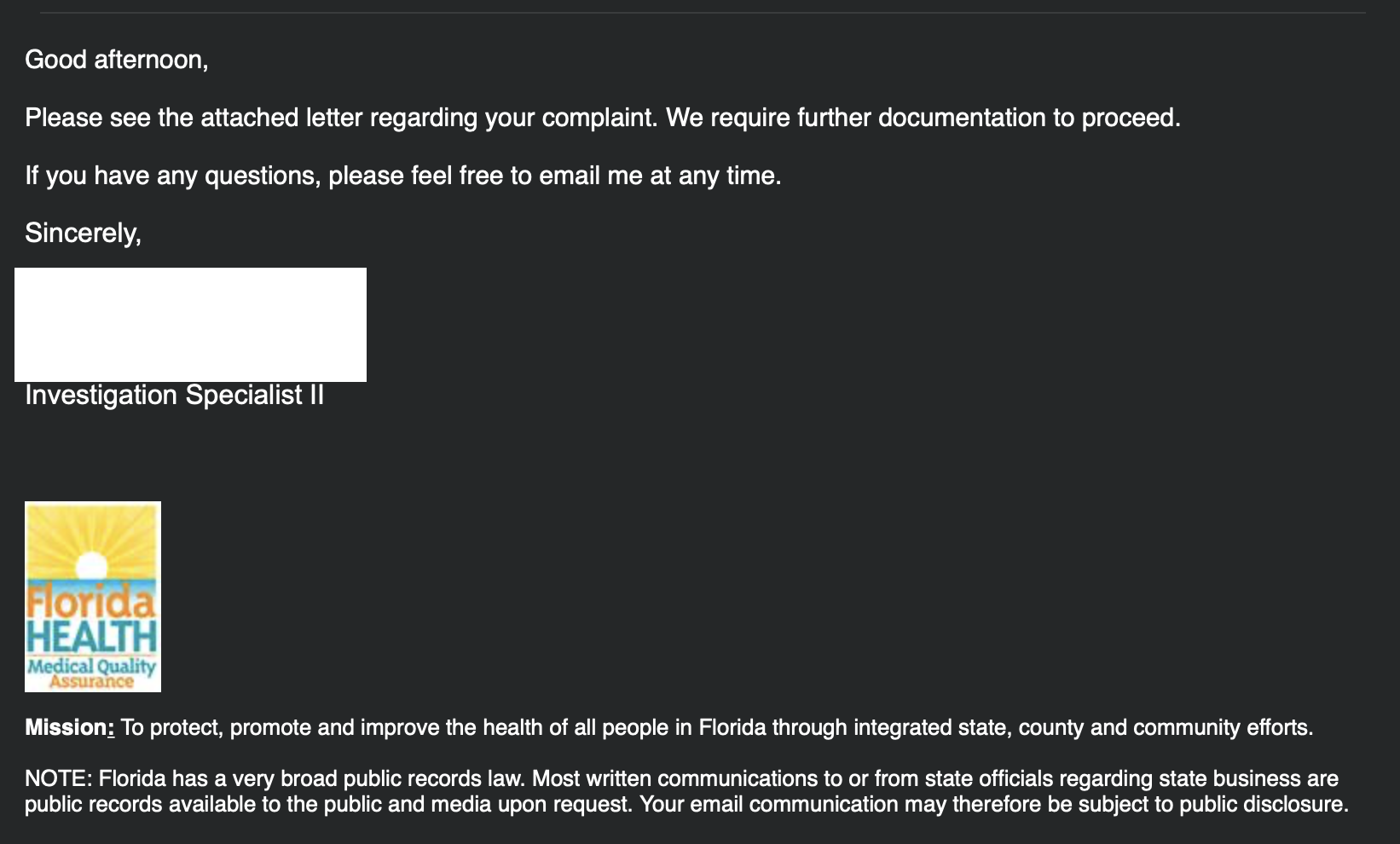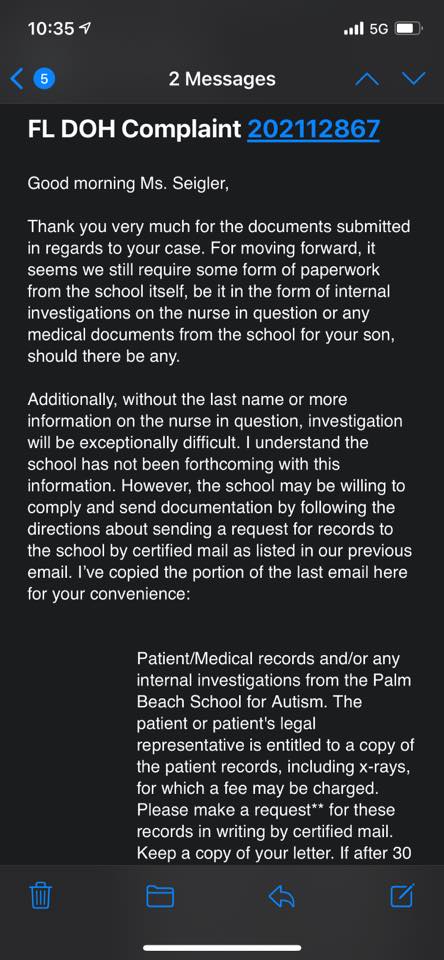 After A was home, I had finally stopped shaking. This nurse could have KILLED HIM. I got on the computer right away to file a report with the department of health. In Florida, all reports for health professionals go through the department of health. The first school refused to give me the nurse’s name. I only had her first name so I filled it out with the information I had. I had to wait.