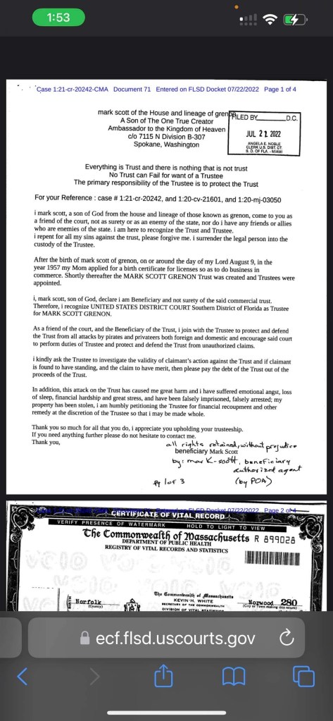 On March 14, 2022, Mark Grenon Filed a 13-page court document demanding “full immunity and without recourse” for his full cooperation. Interesting how his sons are not on the document. He is suing “The People of the United States.”