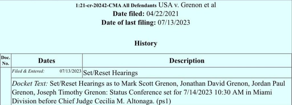Docket Text: Set/Reset Hearings as to Mark Scott Grenon, Jonathan David Grenon, Jordan Paul Grenon, Joseph Timothy Grenon: Status Conference set for 7/14/2023 10:30 AM in Miami Division before Chief Judge Cecilia M. Altonaga. (ps1)