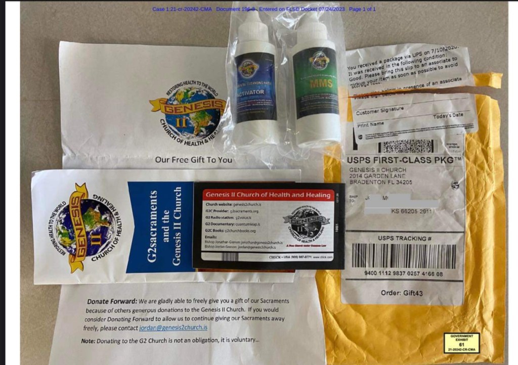 “The indictment further alleges that before marketing MMS as a cure for COVID-19, the Grenons marketed MMS as a miracle cure-all for dozens of other serious diseases and disorders, even though the FDA had not approved MMS for any use. The Grenons sold tens of thousands of bottles of MMS nationwide, including to consumers throughout South Florida, according to the allegations. They sold this dangerous product under the guise of Genesis II Church of Health and Healing (“Genesis”), an entity they are accused of creating to avoid government regulation of MMS and shield themselves from prosecution. According to charging documents, Genesis’ own websites describe Genesis as a “non-religious church,” and Defendant Mark Grenon, the co-founder of Genesis, has repeatedly acknowledged that Genesis “has nothing to do with religion,” and that he founded Genesis to “legalize the use of MMS” and avoid “going [ ] to jail.” The Genesis website further stated that MMS could be acquired only through a “donation” to Genesis, but the donation amounts for MMS orders were set at specific dollar amounts and were mandatory, such that the donation amounts were effectively just sales prices. The indictment alleges that the Grenons received more than $1 million from selling MMS.”
