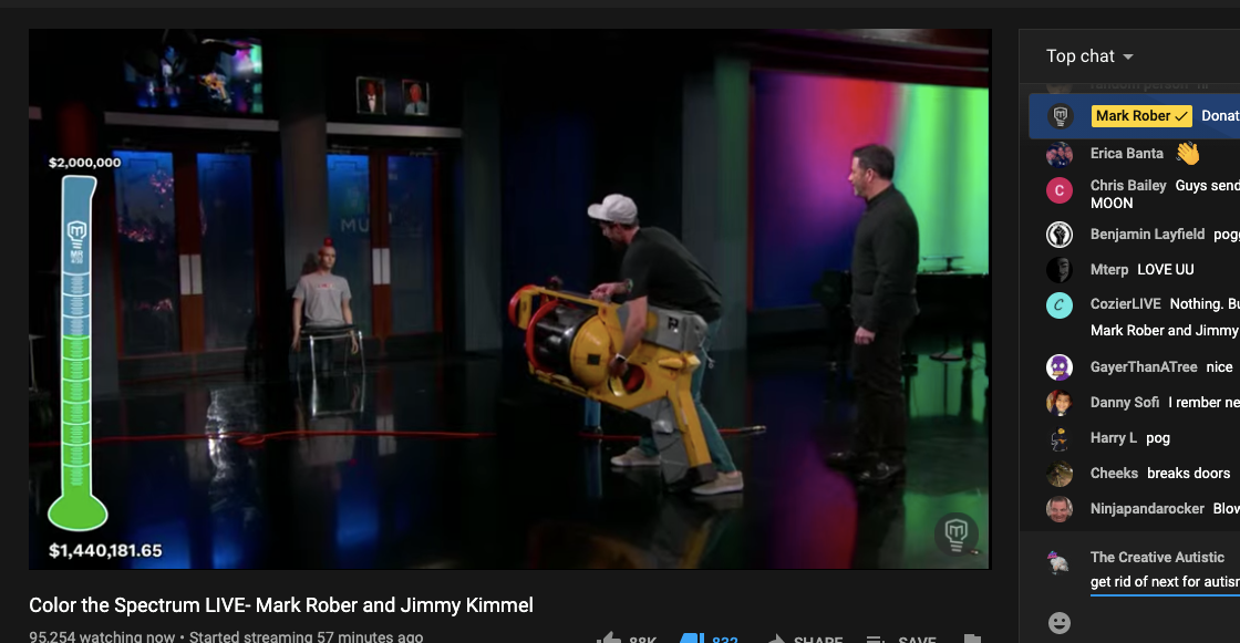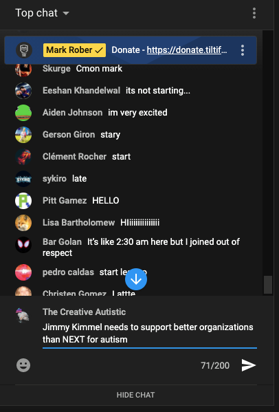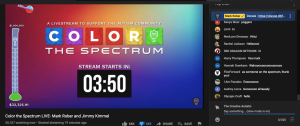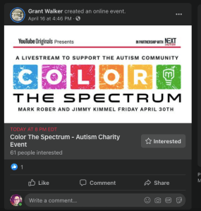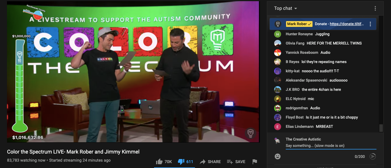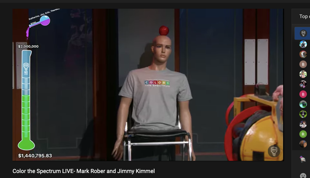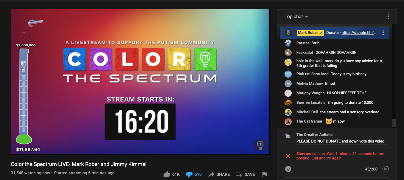 Color the Spectrum was a 3 hour live stream event hosted by Youtube as a fundraiser for NEXT for Autism. It was hosted by Jimmy Kimmel and Mark Rober. Jimmy Kimmel cannot be educated. He attacked diabetic kids and kids who were scared of an earthquake. It raised about $3 million dollars for their programs. They never consult autistic people. They insist on speaking over us.