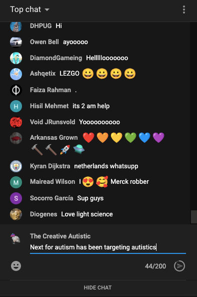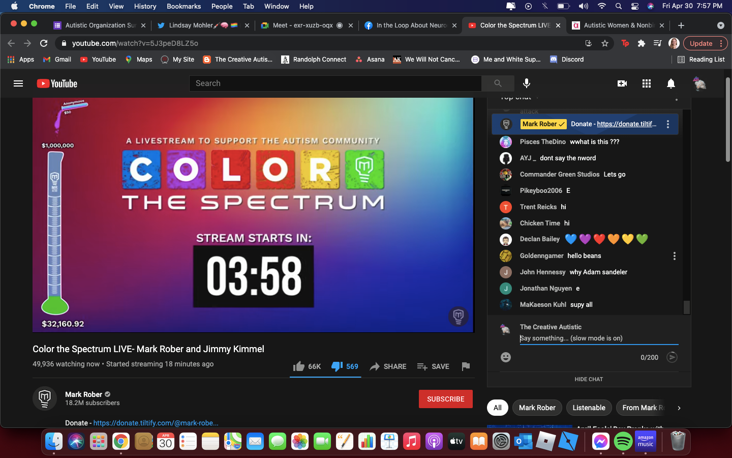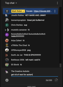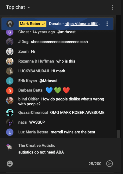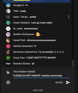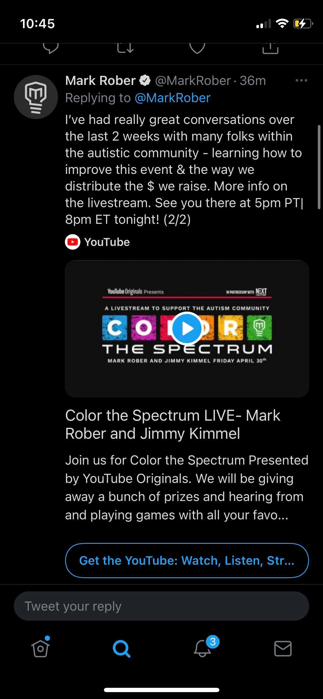 Color the Spectrum was a 3 hour live stream event hosted by Youtube as a fundraiser for NEXT for Autism. It was hosted by Jimmy Kimmel and Mark Rober. Jimmy Kimmel cannot be educated. He attacked diabetic kids and kids who were scared of an earthquake. It raised about $3 million dollars for their programs. They never consult autistic people. They insist on speaking over us.