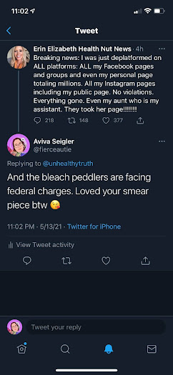 Erin Elizabeth Finn is a self proclaimed “health nut” from Florida. She is one of the “disinformation dozen” who are responsible for spreading 65% of all anti vax content on Facebook She has her blog Health Nut News has been deplatformed from Facebook and Instagram. She lost all her Facebook groups, pages and her personal profile. Her facebook page had more than 500,000 followers. Her facebook group Holistic Lives Matter had about 53,000 members. Her Instagram account has been deleted. She had over 112 THOUSAND followers on Instagram. All went POOF! She still has her Youtube, Pinterest and others. Her website has been banned by Pintrest, thankfully.