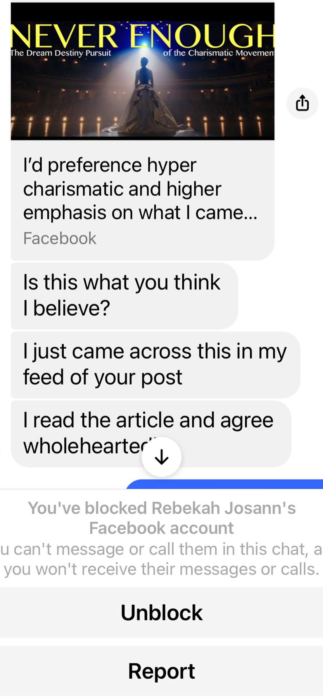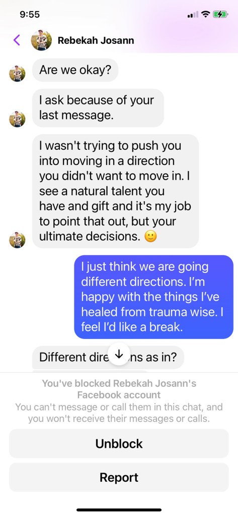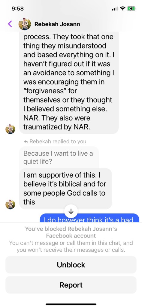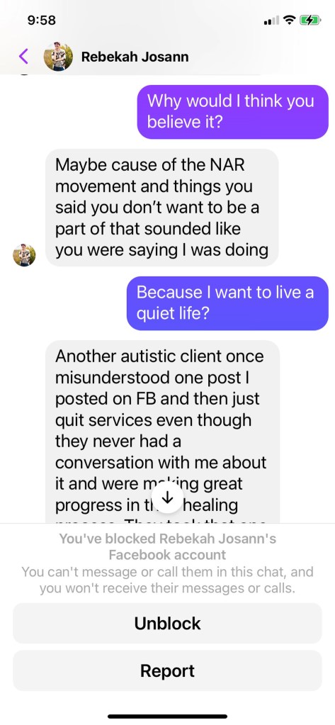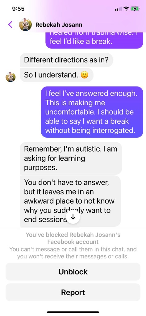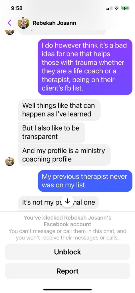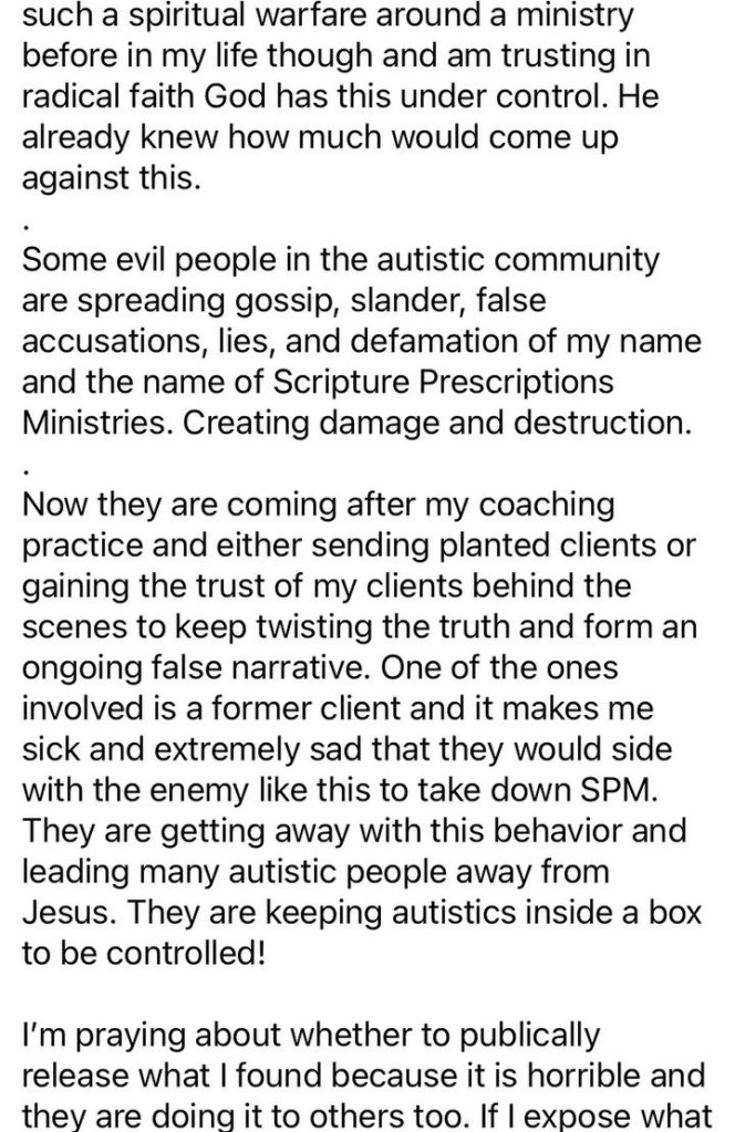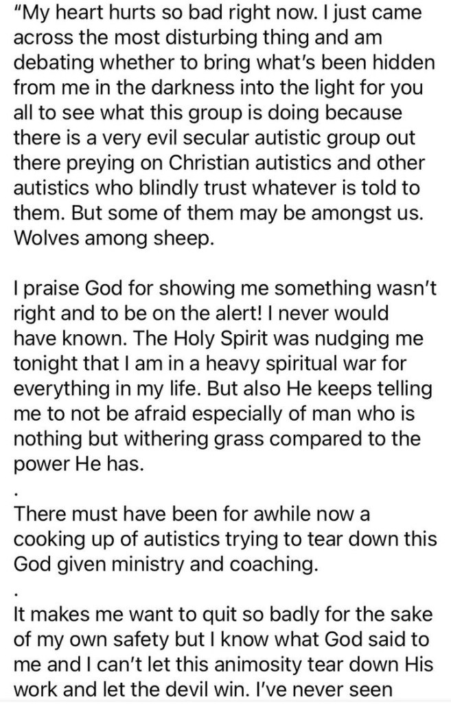 She joined her Autistic Christian group last year and is pretty sure that Rebekah sought her out after she posted in the group about her own personal trauma. She has a history of spiritual abuse from the past that was still happening.