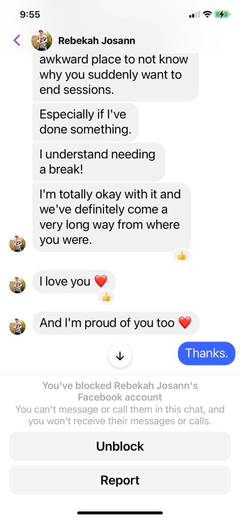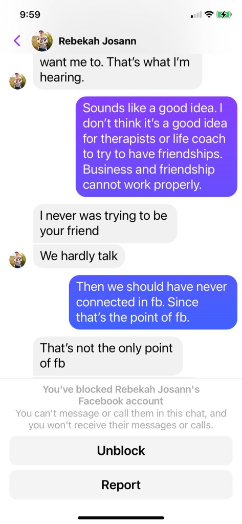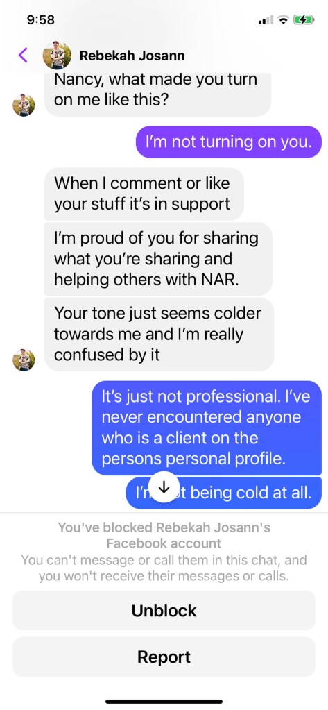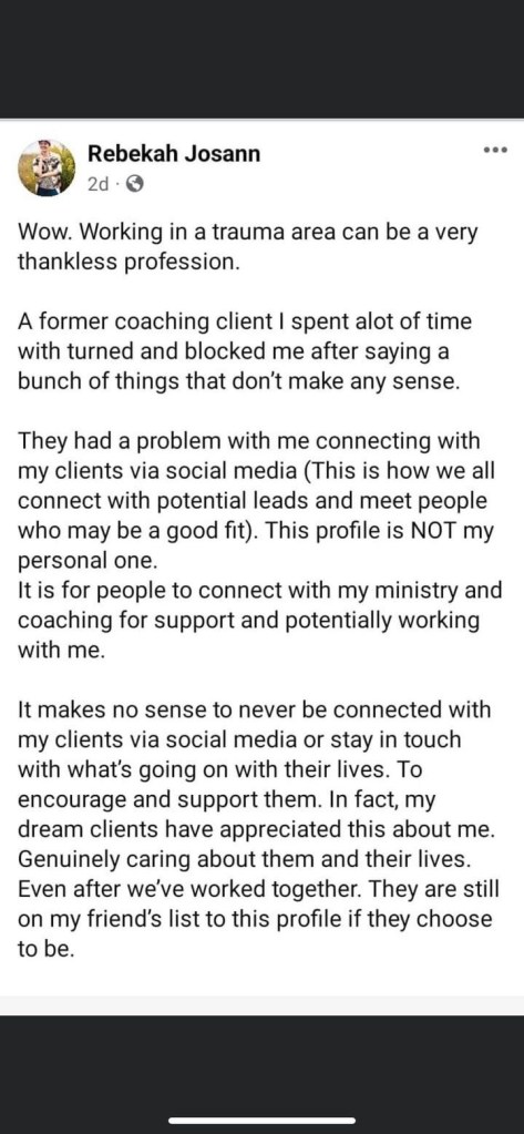 My informant thinks Rebekah might have helped in one way but a lot of it was her stalking her personal Facebook page and monitoring her posts. After creeping her page, Rebekah then claimed in sessions that the informant was triggered. Rebekah then told the informant that she needed to stop posting on her own Facebook page because she was “feeding into stuff.”