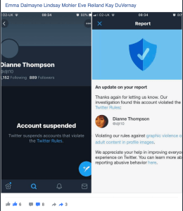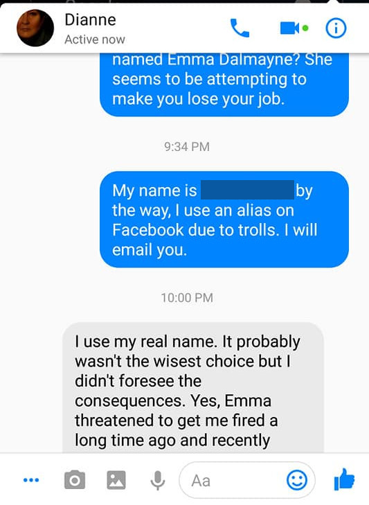 After these tweets, Dianne did some research into Emma and did not like what she saw. These exchanges were with Dianne and Emma but Dianne did not know it was Emma. Emma is really good at what she does.