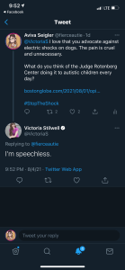 A dog trainer that I had been following for years, Victoria Stillwell, is against electric shock. When I tweeted her, telling her about the Judge Rotenberg Center, she was shocked!