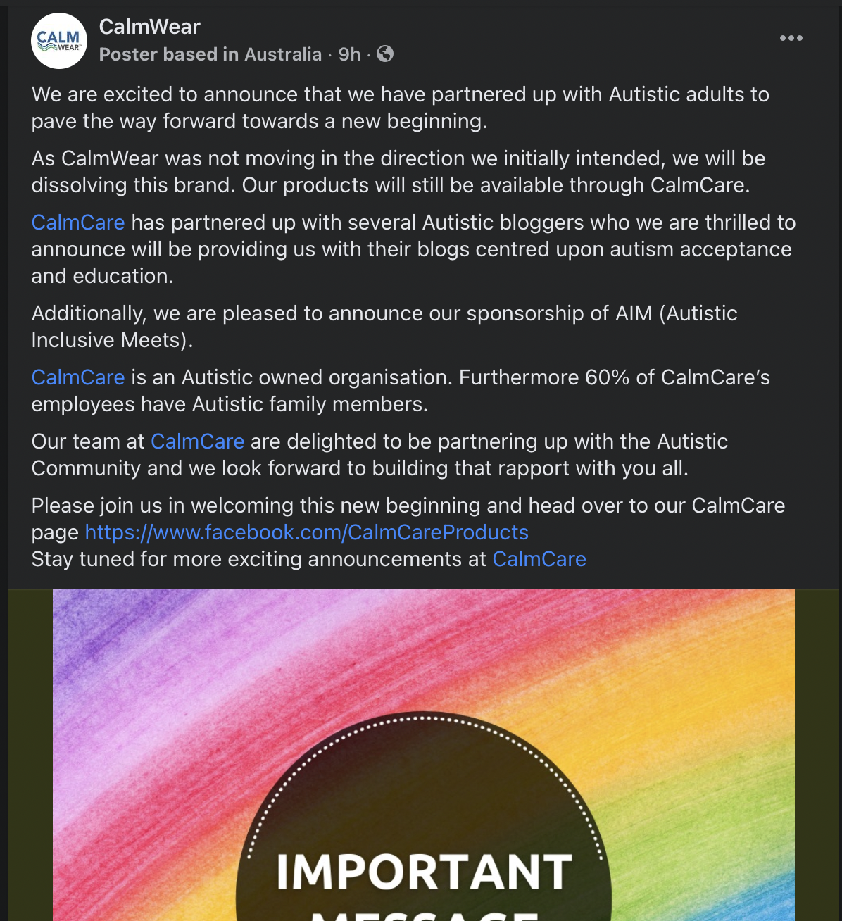 After the owner of the parent company , Jettproof was made aware of what Connie was doing by autistic adults, they rebranded as CalmCare and Made this announcement:
