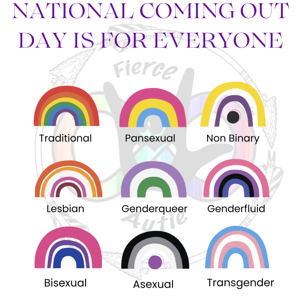 October 11 is National Coming Out Day. You can be lesbian, gay, bisexual, pansexual, non-binary, transgender, asexual, queer, or anything in between. It is time to be proud of who you are and your support for queer equality and National Coming Out Day. Over 70% of autistics identify as queer.