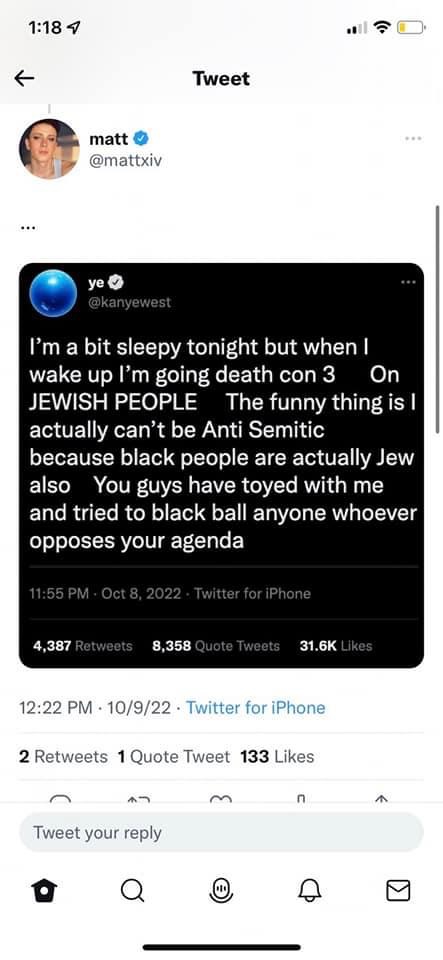 Kanye West made an extremely antisemitic tweet that said, “I’m a bit sleepy tonight but when I wake up I’m going death con on JEWISH PEOPLE The funny thing is I actually be Anti-Semitic because black people are actually Jew also You guys toyed with me and tried to black ball anyone who opposes your agenda.” At least West was locked out of his Instagram and Twitter accounts due to this goyish meshugaas (non-Jewish nonsense). He tweeted one antisemitic tweet after another.