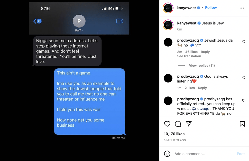 The post that this was referencing was also antisemitic. It was a text exchange between West and Diddy that was posted on Instagram. West told him, “Ima use you as an example to show the Jewish people that told you to call me that no one can threaten or influence me. I told you this was war.”