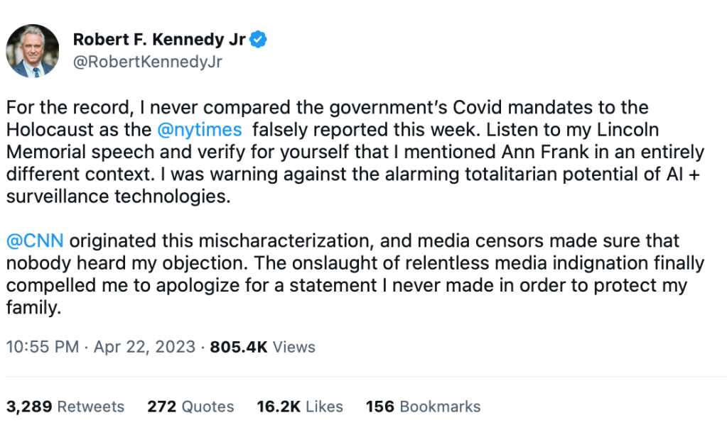 On January 25, 2022, RFK Jr apologizes for his antisemitic remarks. After backlash from the public and his sister, Kerry Kennedy, for his comparison to Anne Frank during his anti-vaccine speech, he issued an apology.